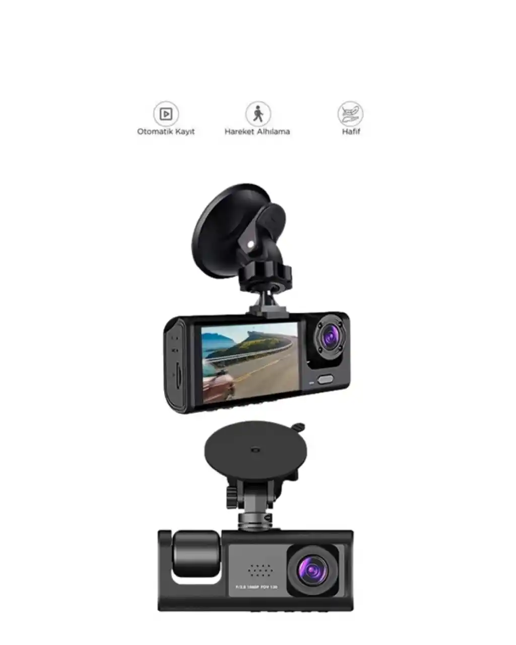 Bu araç içi kamera sistemi, kompakt boyutlarına rağmen sunduğu üçlü kamera sistemiyle maksimum güvenlik sağlar. 1080p çözünürlüklü ön kamera ile trafikteki detayları kaçırmazken, 720p iç ve arka kameralar aracınızın içini ve arkasını aynı anda kayıt altına alır. 170° geniş açı lens sayesinde kör nokta kalmaz. Gece görüş fonksiyonu, ışık seviyesinin düşük olduğu ortamlarda bile net ve detaylı kayıt yapılmasına olanak tanır. Kullanımı kolay 2.0 inç LCD ekran, tüm ayarlara erişim imkânı verir. Hareket algılama teknolojisi, park halindeyken dahi potansiyel tehditleri kayda alır. G-Sensör ise çarpma veya ani frenleme durumunda görüntüleri otomatik olarak kilitleyerek silinmesini önler. Dayanıklı, suya ve toza karşı dirençli yapısıyla her araçta güvenle kullanılabilir.