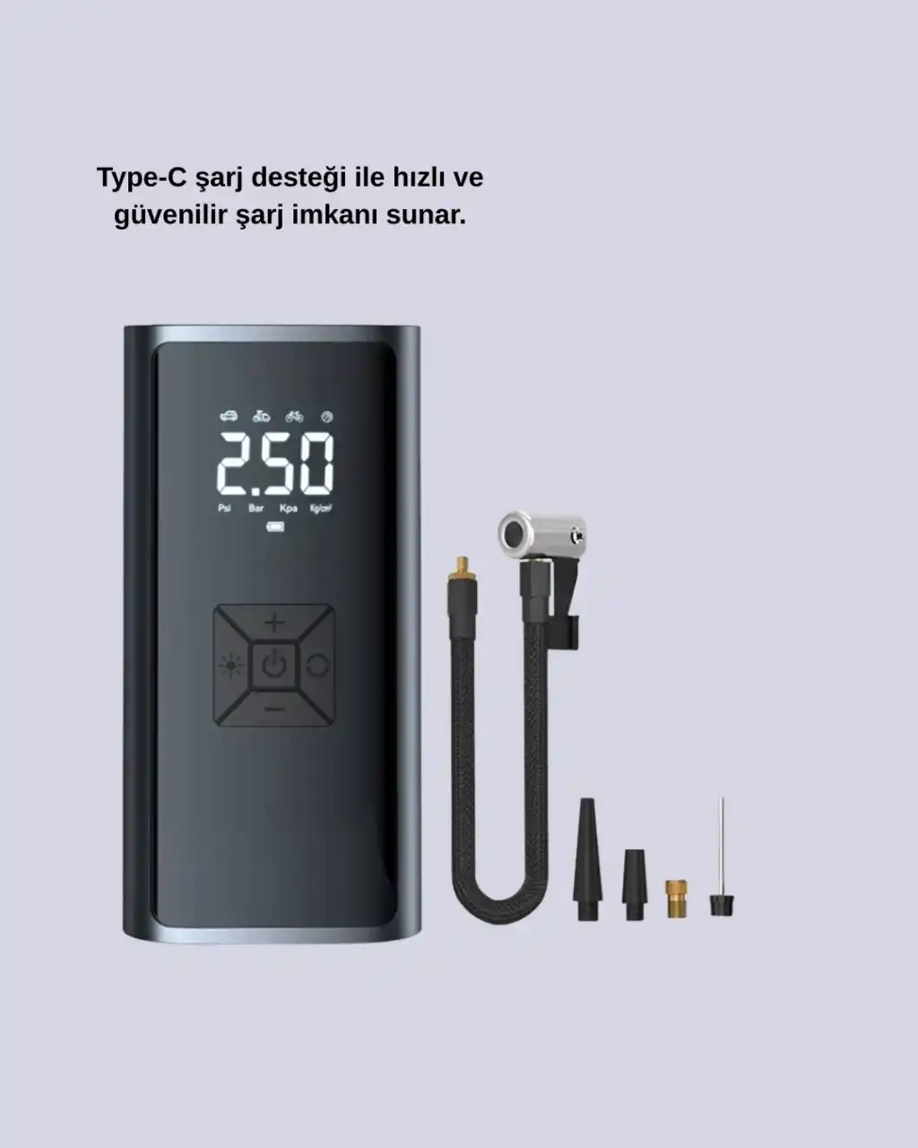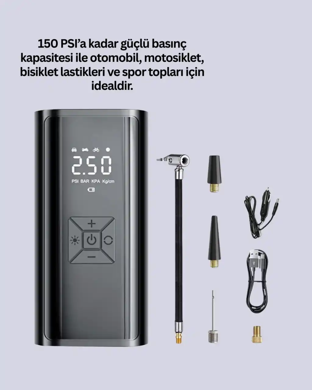 Çok işlevli taşınabilir hava kompresörü, sürücüler için güvenlik ve konforu artıran bir üründür. 80W motor gücü ile arabalar, motosikletler, bisikletler ve spor topları için güçlü performans sunar.Dijital ekranı sayesinde basınç değerlerini hassas bir şekilde görüntüleyebilirsiniz. Kablosuz şişirme teknolojisi, hızlı ve pratik bir kullanım imkanı sağlar. Kompakt boyutu sayesinde kolayca taşınır ve aracınızda az yer kaplar.LED aydınlatma özelliği gece sürüşlerinde veya düşük ışıkta rahat kullanım sunarken, SOS ışıkları acil durumlarda güvenliğinizi artırır. Naylon örgü güçlendirilmiş gövdesi, kırılmaya karşı dayanıklı ve uzun ömürlüdür.Şişme yatak, deniz ürünleri ve spor topları gibi farklı ürünleri de şişirebilme imkanı sunan bu cihaz, seyahatlerde ve günlük yaşamda işinizi kolaylaştırır. Dayanıklı yapısı, güçlü motoru ve kullanıcı dostu arayüzüyle araç sahipleri için vazgeçilmez bir yardımcıdır.