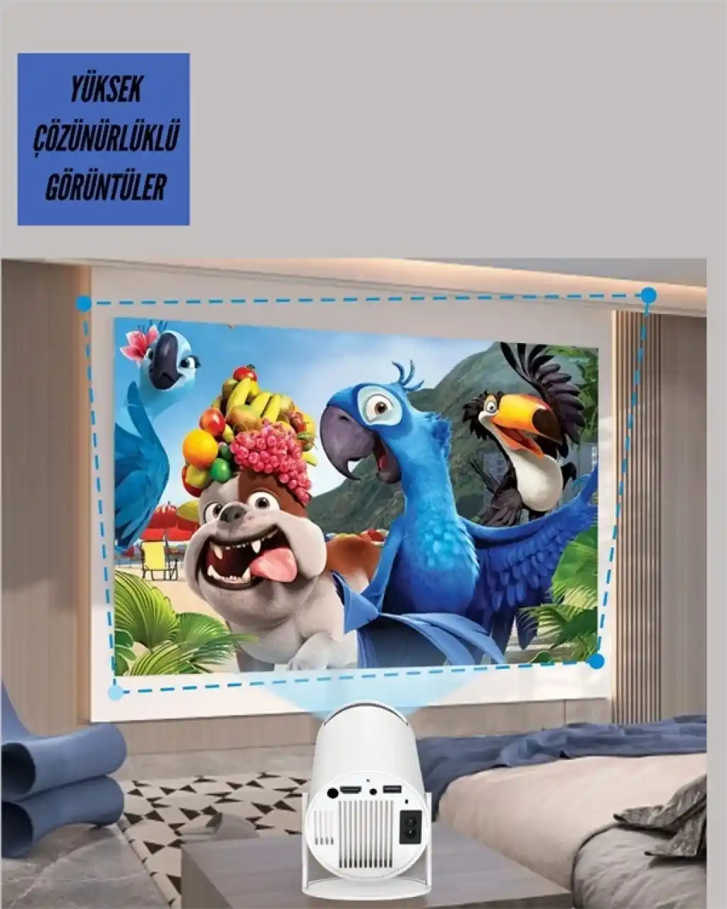Gelişmiş teknolojiyle donatılmış bu kablosuz akıllı projeksiyon cihazı, hem günlük kullanım hem de profesyonel sunum ve eğlence ihtiyaçları için ideal bir çözümdür. 4K ultra HD çözünürlüğü, güçlü bağlantı seçenekleri, zengin uygulama desteği ve taşınabilir yapısıyla sinema keyfini, oyun deneyimini ve sunum verimliliğini bir araya getirir.Ürün Özellikleri & Açıklamaları1. 4K Ultra HD Çözünürlük Desteği 3840x2160 çözünürlük desteği ile sinema kalitesinde net ve keskin görüntüler sunar. Film, dizi, oyun veya sunumlarda renkler daha canlı, detaylar daha derindir. Büyük ekranlarda görüntü kaybı olmadan kaliteli görsel deneyim sağlar.2. Kablosuz Bağlantı Özellikleri (Wi-Fi 6 & Bluetooth 5.0) Wi-Fi 6 teknolojisi, hızlı ve kesintisiz internet bağlantısı sağlar. Yüksek çözünürlüklü içerikler takılmadan oynatılır. Bluetooth 5.0 desteği sayesinde kulaklık, hoparlör, oyun kumandası gibi cihazlarla kablosuz bağlantı kurabilirsiniz. Kablo karmaşasını ortadan kaldırır, hareket özgürlüğü sunar.3. Çoklu Bağlantı Seçenekleri HDMI Girişi: Bilgisayar, oyun konsolu, medya oynatıcı gibi cihazlarla uyumludur. USB Girişi (2 adet): Harici disk, USB bellek, mouse veya klavye bağlantısı yapılabilir. AUX Girişi: Harici ses sistemlerine bağlanabilir. RJ45 Ethernet Portu: İsteğe bağlı olarak kablolu ağ bağlantısı sağlar. Type-C PD Girişi: Cihaz kullanılırken şarj edilebilir.4. 10.000+ Oyun ve 4.000+ Uygulama Desteği Android tabanlı işletim sistemi sayesinde cihaz üzerinden Google Play gibi mağazalardan doğrudan uygulama ve oyun indirilebilir. Netflix, YouTube, Amazon Prime, Zoom, Spotify, Office uygulamaları gibi popüler uygulamalar desteklenir. Ayrıca 10.000'den fazla mobil oyun desteği ile eğlenceli bir oyun deneyimi sunar.5. Ekran Yansıtma (Screen Mirroring / Miracast / AirPlay) Akıllı telefon, tablet ya da bilgisayar ekranınızı cihazın ekranına anında yansıtabilirsiniz. Video, fotoğraf, sunum, dosya gibi içerikler büyük ekranda rahatlıkla paylaşılır. Android ve iOS cihazlarla tam uyumludur.6. Ayarlanabilir Çift Kollu Tasarım Cihazın çift kollu destek sistemi sayesinde farklı açılarda kolayca konumlandırılabilir. Tavan, masa veya tripod üzerinde sabit kullanım için uygundur. Kolay kurulum ve sağlam yapı, her ortamda güvenli kullanım sunar.7. Kompakt ve Taşınabilir Tasarım Cihaz sadece 1.2 kg ağırlığında olup kolayca taşınabilir. Kompakt ölçüleri sayesinde çantanızda, valizinizde ya da araçta yer kaplamadan taşınabilir. Ev, ofis, kamp, okul gibi birçok ortamda pratik kullanım sağlar.Teknik Özellikler (Detaylı) ÖzellikAçıklamaÇözünürlük Desteği4K Ultra HD (3840x2160)Kablosuz BağlantıWi-Fi 6, Bluetooth 5.0HDMI Girişi1 adetUSB Girişi2 adet USB 3.0AUX Girişi1 adet 3.5mm jackEthernet GirişiRJ45 LAN PortuType-C Şarj DesteğiVar (PD destekli)Ekran YansıtmaMiracast, AirPlay, DLNAİşletim SistemiAndroid tabanlıUygulama Desteği4.000+ uygulamaOyun Desteği10.000+ mobil oyunProjeksiyon Mesafesi1.5 – 5 metre arasıGörüntü Boyutu30 – 200 inç arasıHoparlörDahili stereoSoğutma SistemiSessiz fan teknolojisiAğırlıkYaklaşık 1.2 kgBoyutlar22 x 16 x 9 cm